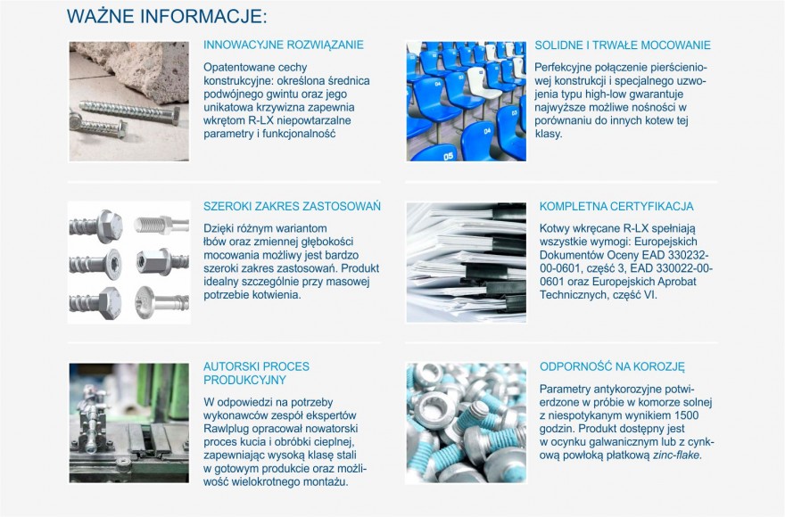 Kotwy wkręcane R-LX Rawlplug spełniają wszystkie wymogi Europejskich Dokumentów Oceny EAD 33023200-0601, część 3 (kotwy metalowe do betonu – kotwy podcinające), EAD 330022-00-0601 oraz są zgodne z wytycznymi części VI ETAG 00. Gotowe do użycia.